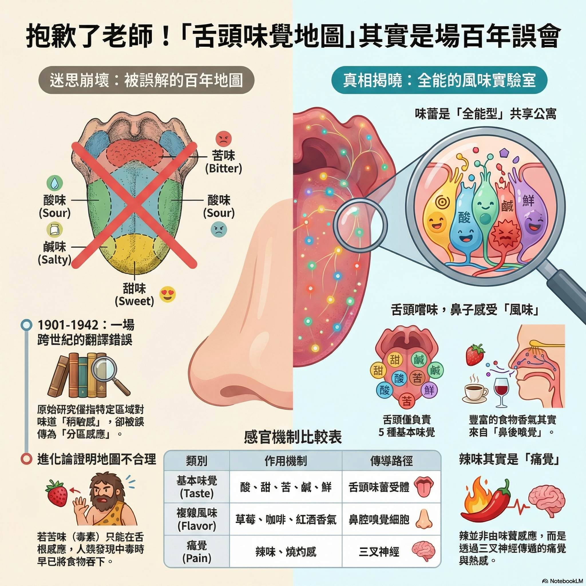 但今天,我們要開門見山地宣布一個足以讓你懷疑人生的真相:這張地圖是錯的,而且錯得徹頭徹尾。即便在最權威的教科書裡,「事實」有時也具備保存期限。讓我們拆解這場橫跨 70 年的誤會,重新認識舌頭這個精密、強大且具備多重備份系統的感官世界。