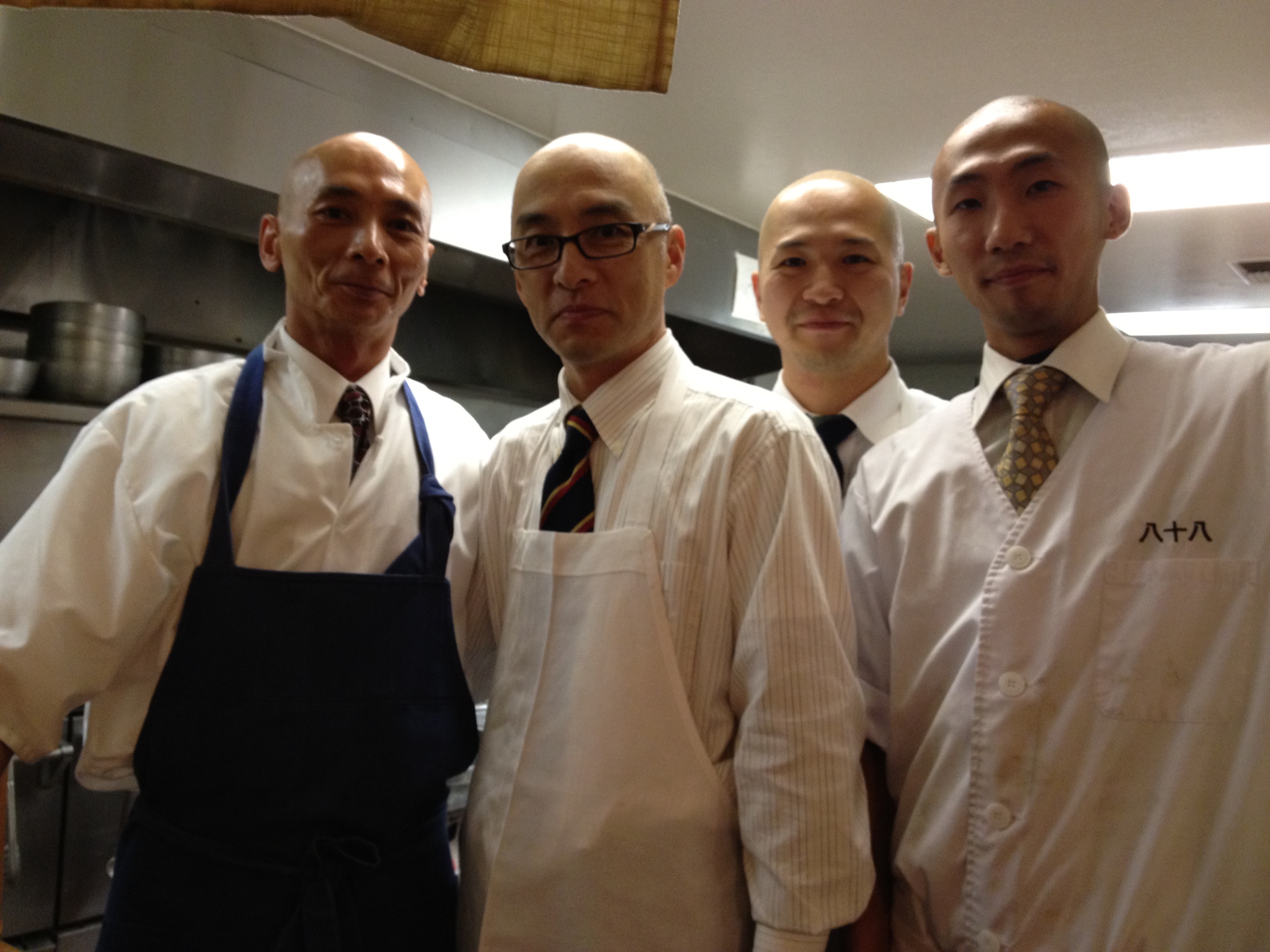 工作一年多後,我又在同一個城鎮、隔一條街的日式懷石料理餐廳「八十八 Hachi Ju Hachi」兼職第二份工作。聽說在日本拜師學藝要剃頭,洗米五年以上,被嚴格教育才有出頭天的一天。在美國,誰會為了進廚房剃頭?我。這件事現在講起來很好笑,但也很真實地反映了當時我對 Suzuki-san 的料理與他口中那套「食物的語言」有多著迷。先特別澄清一下:照片裡左一、左二、左三那幾位本來就是光頭造型,只有我是真的為了進廚房才剃的。