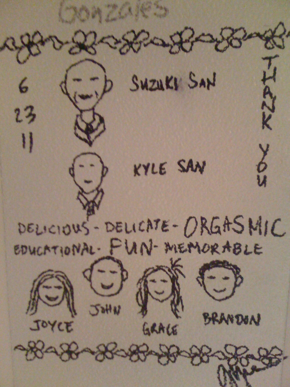 (吃完懷石料理的客人都會在牆壁上留下姓名與留言,其中一位畫了我跟他)